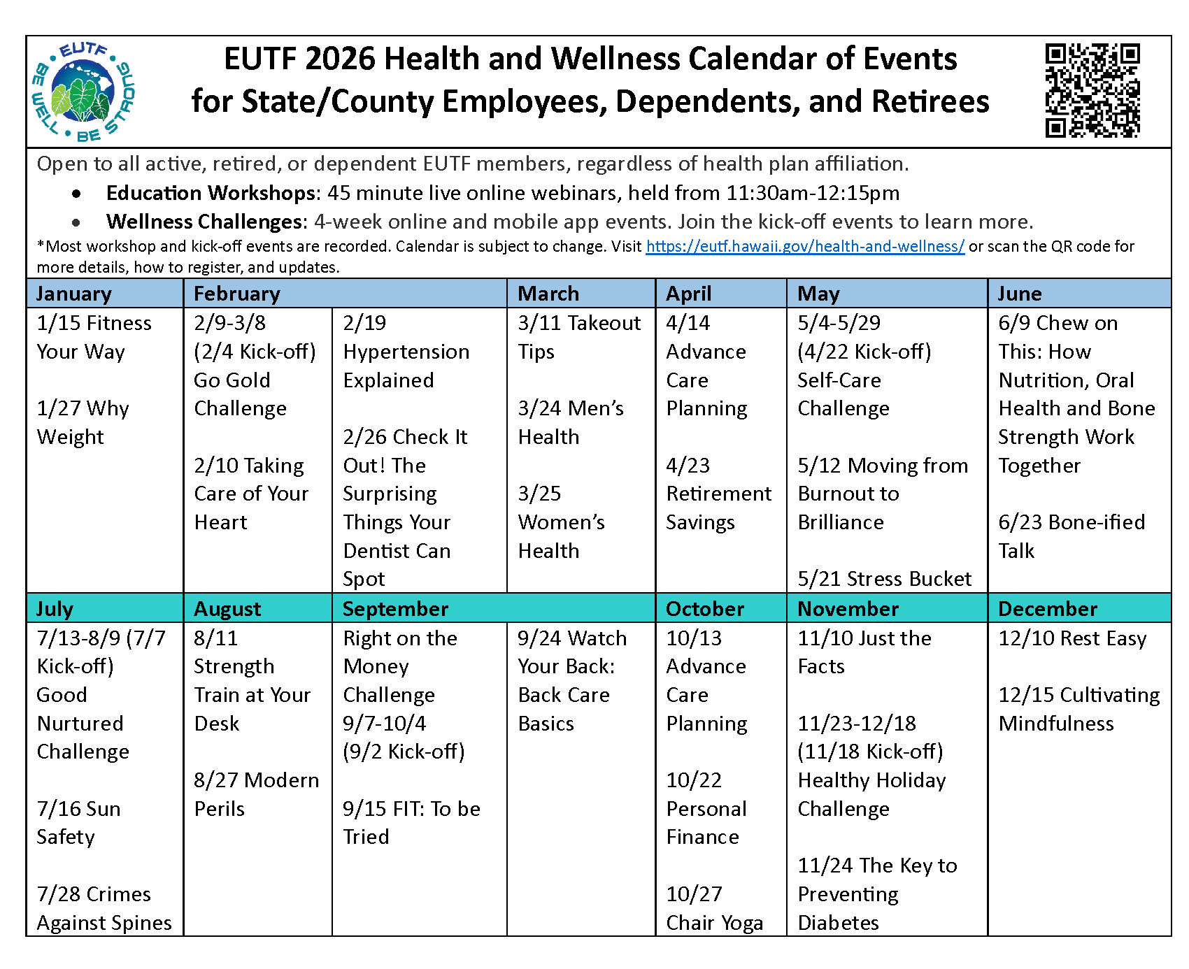 Personal Finance October 23 at 11:30 am Personal finance strategies to help employees identify money challenges, set goals, and take action. Webinar not recorded | Modern Perils November 18 at 12:00 pm Modern health risks, such as excessive screen time, sedentary occupations, and an abundance of ultra-processed foods and beverages, can be harmful. Learn how modifying our behaviors can improve our health and well-being. Case sensitive password: eutf2025 | Why Sleep Matters December 11 at 11:30 am Get simple and effective tools to improve their ability to rest, relax, and sleep. |